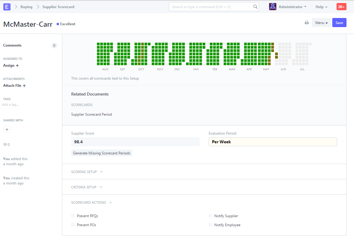 Se genera una evaluación para cada periodo de la tarjeta de puntuación del proveedor haciendo clic en el botón «Generar periodos de la tarjeta de puntuación faltantes». Se puede ver la puntuación actual del proveedor, así como un gráfico que muestra su rendimiento a lo largo del tiempo. Aquí también se indican las acciones tomadas contra el proveedor, incluyendo advertencias al crear solicitudes de presupuesto y órdenes de compra, o la desactivación total de estas funciones.