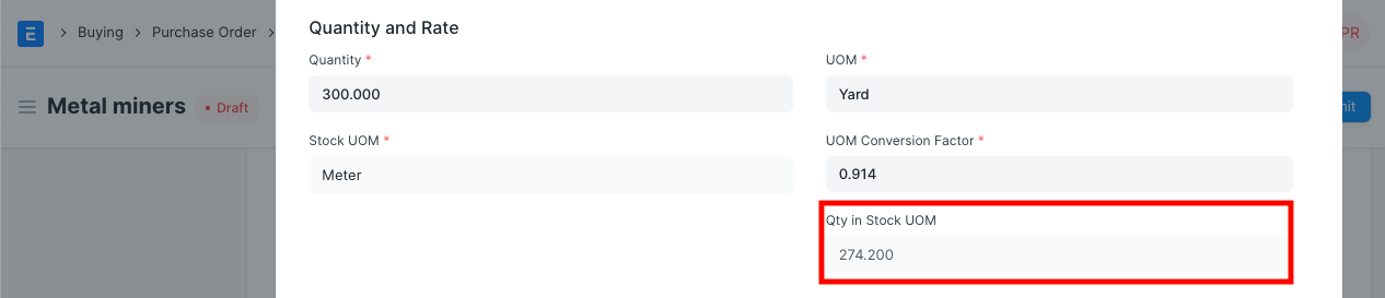 Por ejemplo, si usted ha comprado su materia prima en grandes cantidades con UOM – cajas, y desea almacenarlas en UOM – Nos; puede hacerlo al realizar su orden de compra.