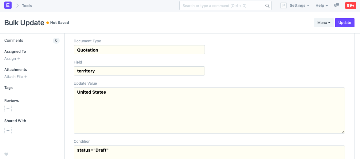 La actualización masiva le permite actualizar un campo particular de un DocType para todos los documentos.