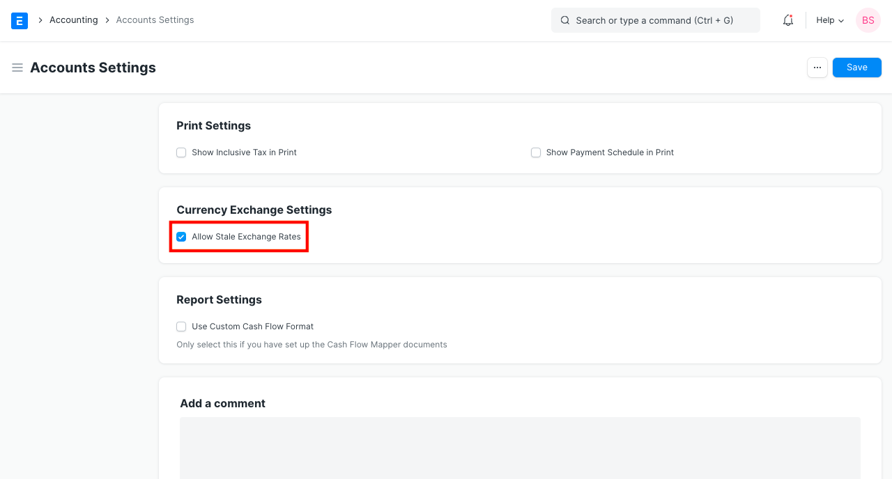En sus transacciones de compra y venta, si el campo «Tipo de cambio» está bloqueado, se debe a que la función de permitir tipos de cambio obsoletos está habilitada. Si desea que el campo «Tipo de cambio» vuelva a ser editable, deshabilite la función «Tipo de cambio obsoleto» desde: