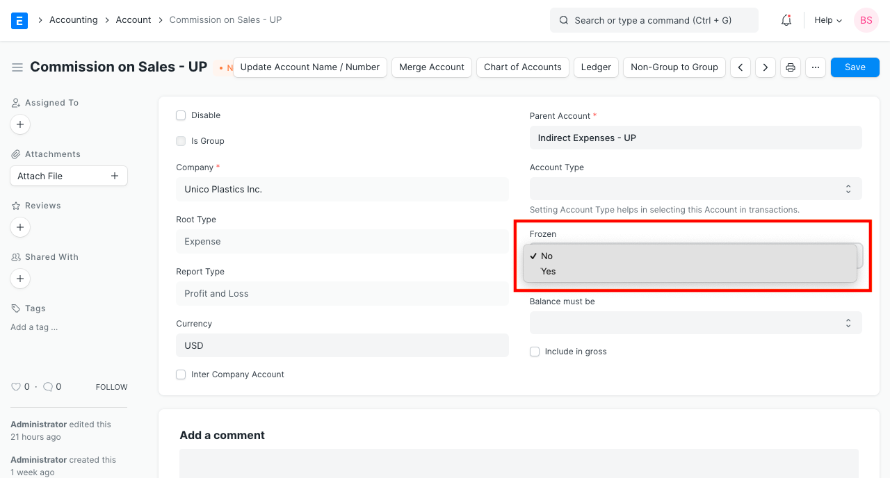 Para congelar una cuenta, vaya al Plan de cuentas y edite una cuenta.