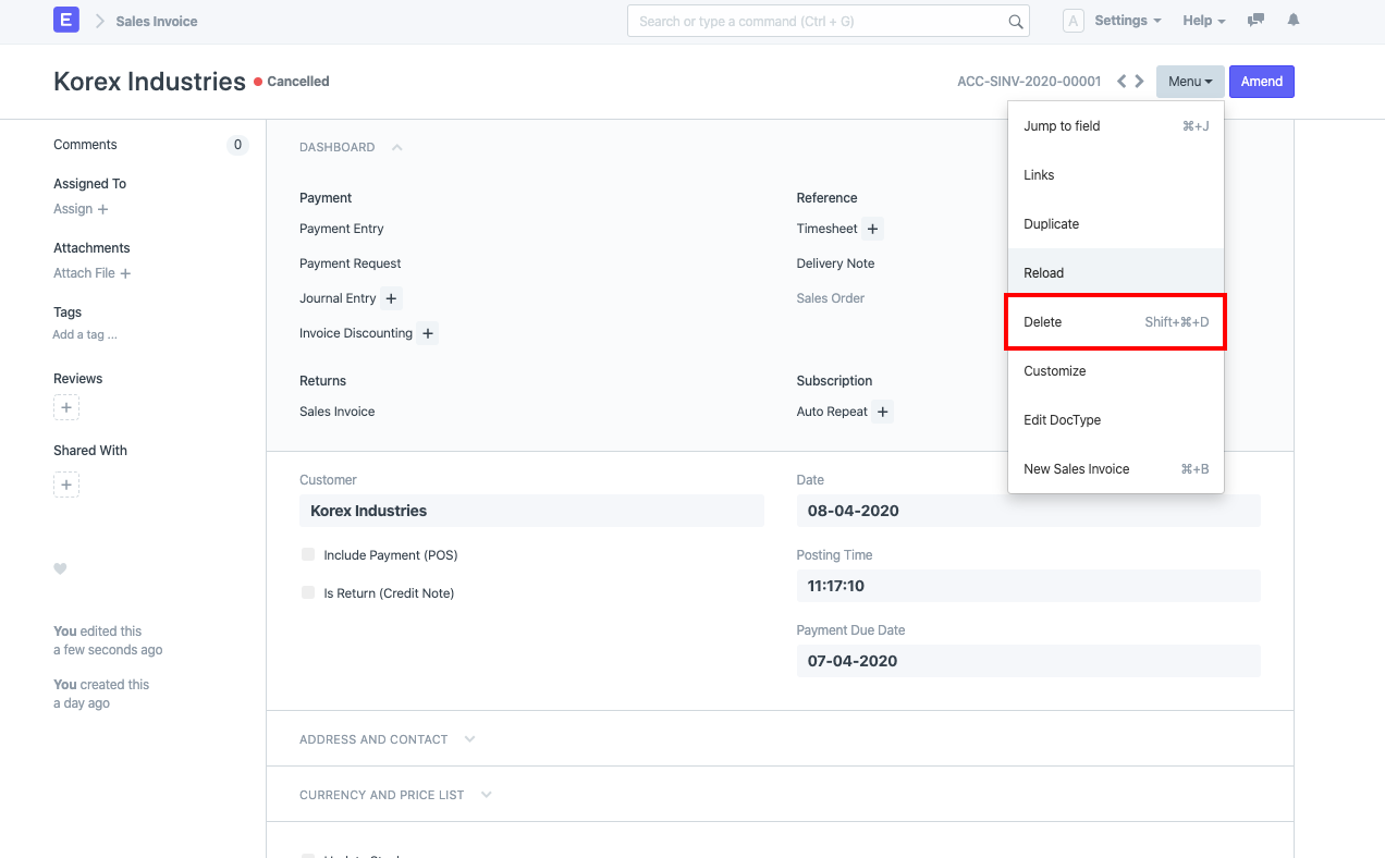 Para eliminar el documento, haga clic en Menú y luego en Eliminar. Esto eliminará el documento seleccionado.