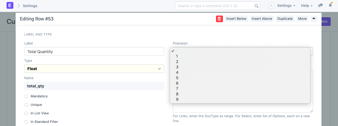 Como alternativa, también puede configurar la precisión de un campo. Para ello, vaya a «Personalizar formulario» y seleccione «Tipo de documento». A continuación, vaya a la fila del campo específico y modifique la precisión. El campo de precisión solo es visible si el tipo de campo es flotante, moneda o porcentaje.