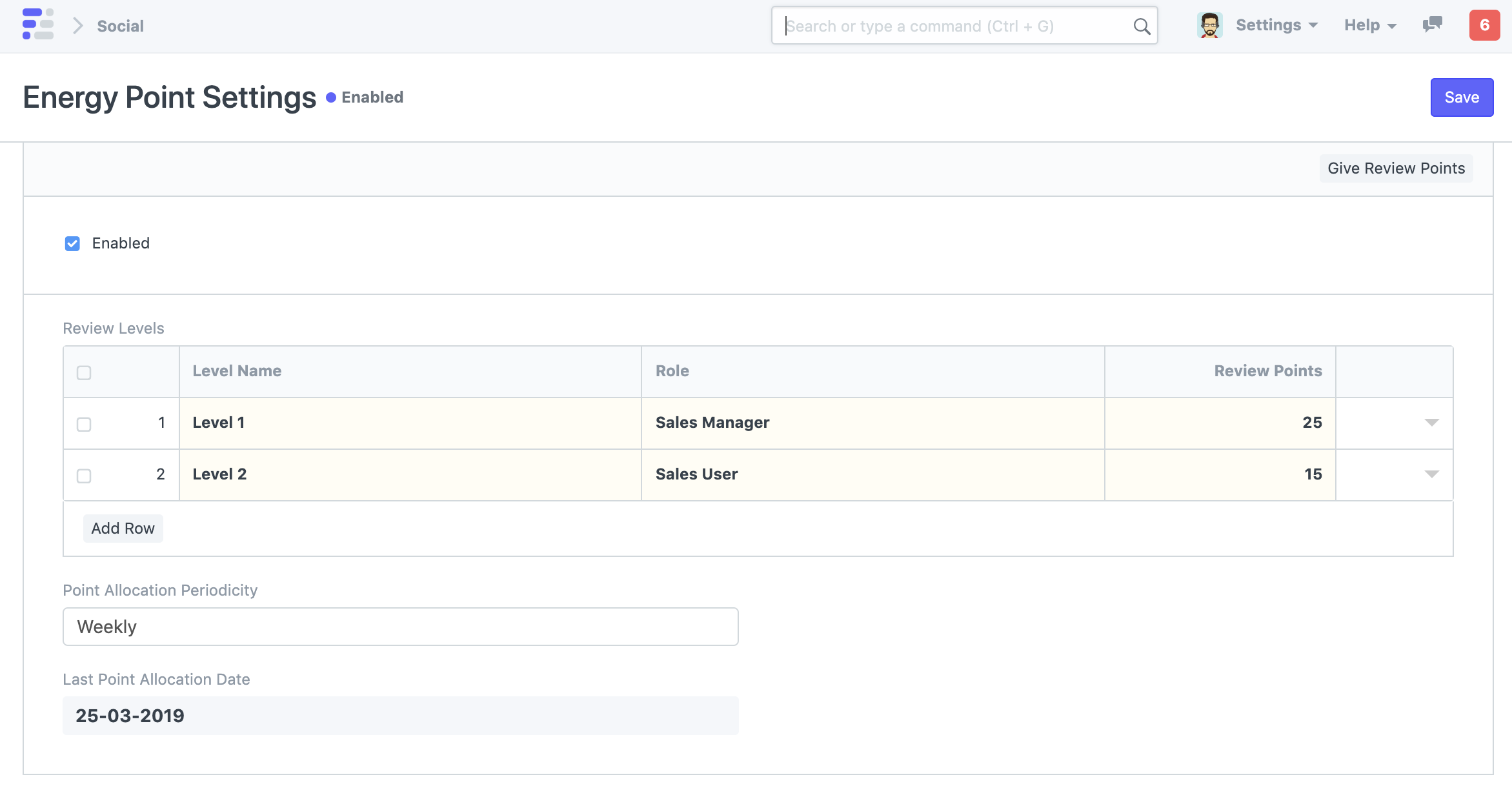 Para habilitar el Sistema de Puntos de Energía, vaya a Configuración de Puntos de Energía y marque Habilitado .