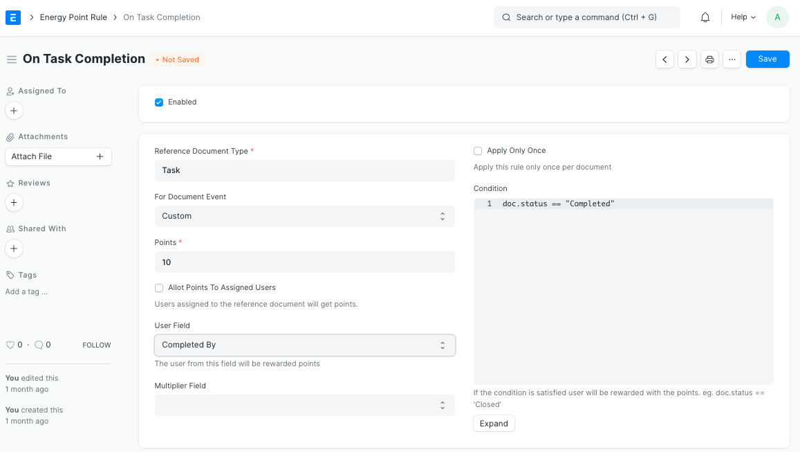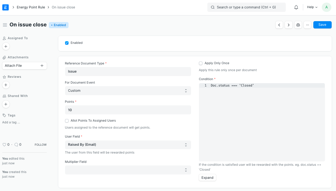 la condición anterior comprobará si el statuscampo del documento está "Cerrado" y, de ser así, se asignarán los puntos al usuario. | | Aplicar solo una vez | La regla se aplicará solo una vez por documento.