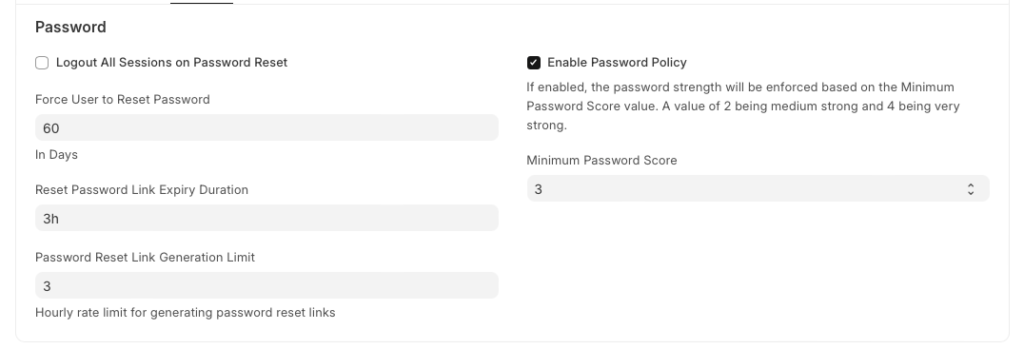 - Límite de generación de enlaces de restablecimiento de contraseña : Con esta configuración, se puede establecer un límite de solicitudes de restablecimiento de contraseña por hora. El límite predeterminado es 3. Si se establece en 0, se permitirá un número ilimitado de solicitudes de restablecimiento de contraseña.