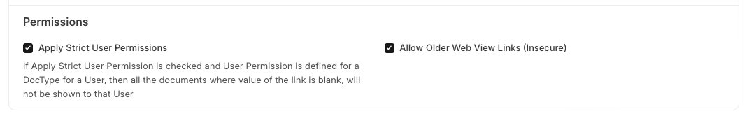 - Aplicar permisos de usuario estrictos: cuando esta casilla de verificación está marcada y el permiso de usuario está definido para un DocType para un usuario, todos los documentos donde el valor del enlace esté en blanco no se mostrarán a ese usuario.