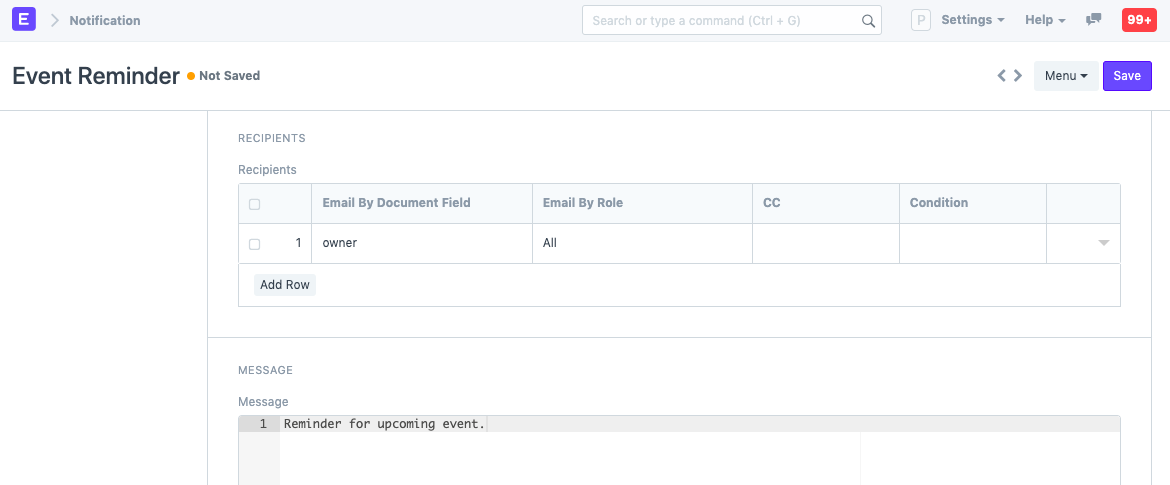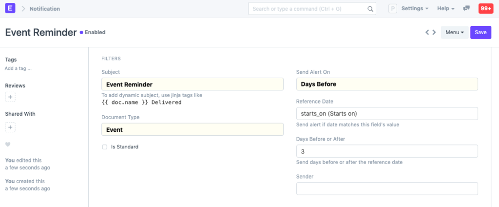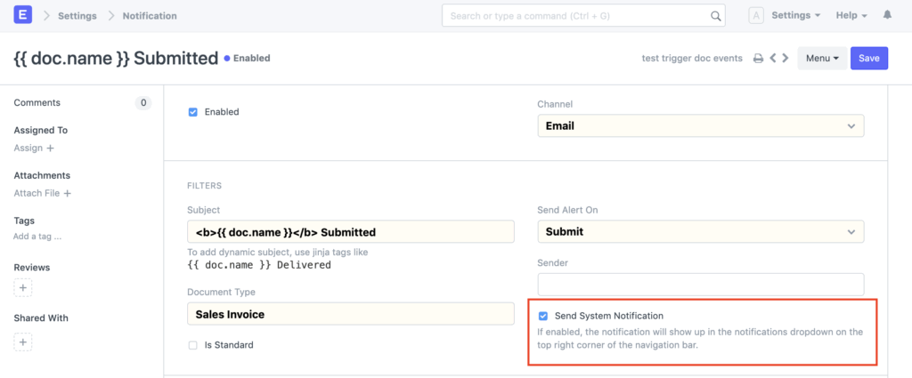 Las notificaciones le permiten establecer condiciones según los datos de campo de sus documentos. Por ejemplo, si desea recibir un correo electrónico si un cliente potencial se ha guardado como «Interesado», indíquelo doc.status == "Interested"en el cuadro de condiciones. También puede establecer condiciones más complejas combinándolas con el operador » y » o » o» .