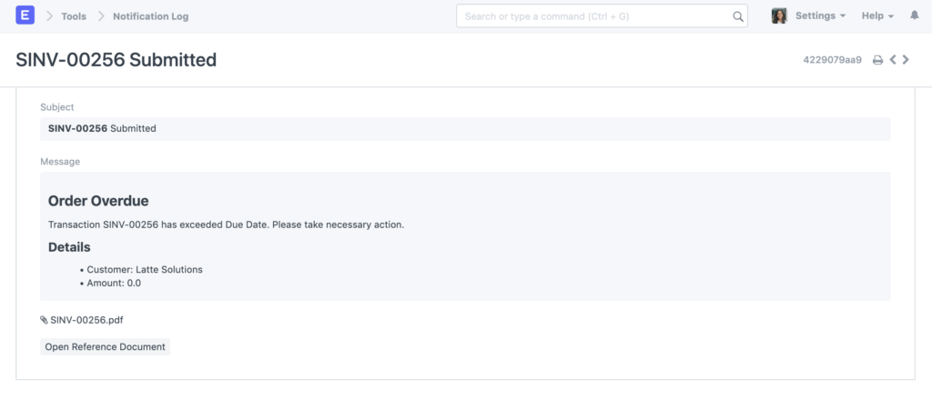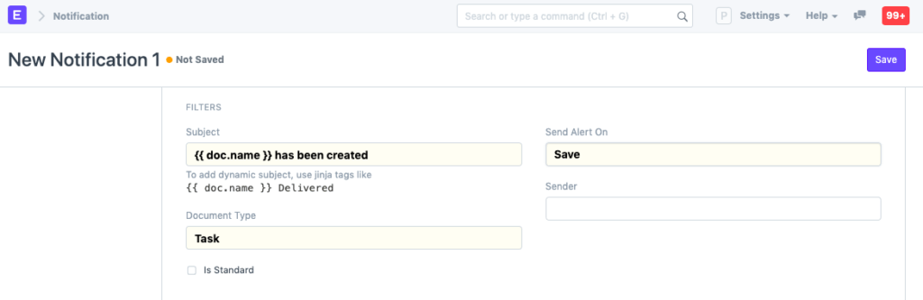 Puedes recuperar los datos de un campo específico usando doc.[field_name]. Para usarlos en el asunto/mensaje, debes rodearlos con {% raw %}{{ }}{% endraw %}. Estas se llaman etiquetas Jinja . Por ejemplo, para obtener el nombre de un documento, usa {% raw %}{{ doc.name }}{% endraw %}. El siguiente ejemplo envía un correo electrónico al guardar una tarea con el asunto «TASK#### has been created» (Se ha creado la tarea n.° …