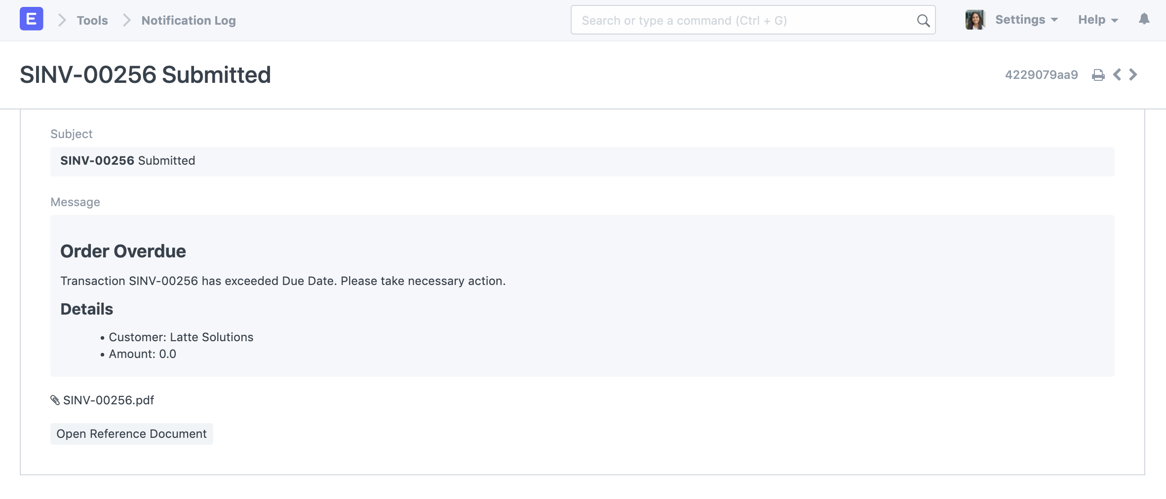 Al hacer clic en las rutas de notificación se accede al documento del Registro de notificaciones que contiene el asunto, el mensaje y el archivo adjunto configurados, si se ha configurado Adjuntar impresión: