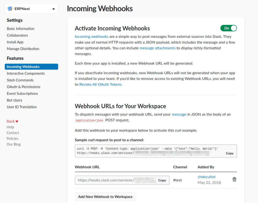 Dale un nombre a tu aplicación y elige el espacio de trabajo adecuado. Una vez creada, ve a la sección «Webhooks entrantes» y añade un nuevo webhook al espacio de trabajo.