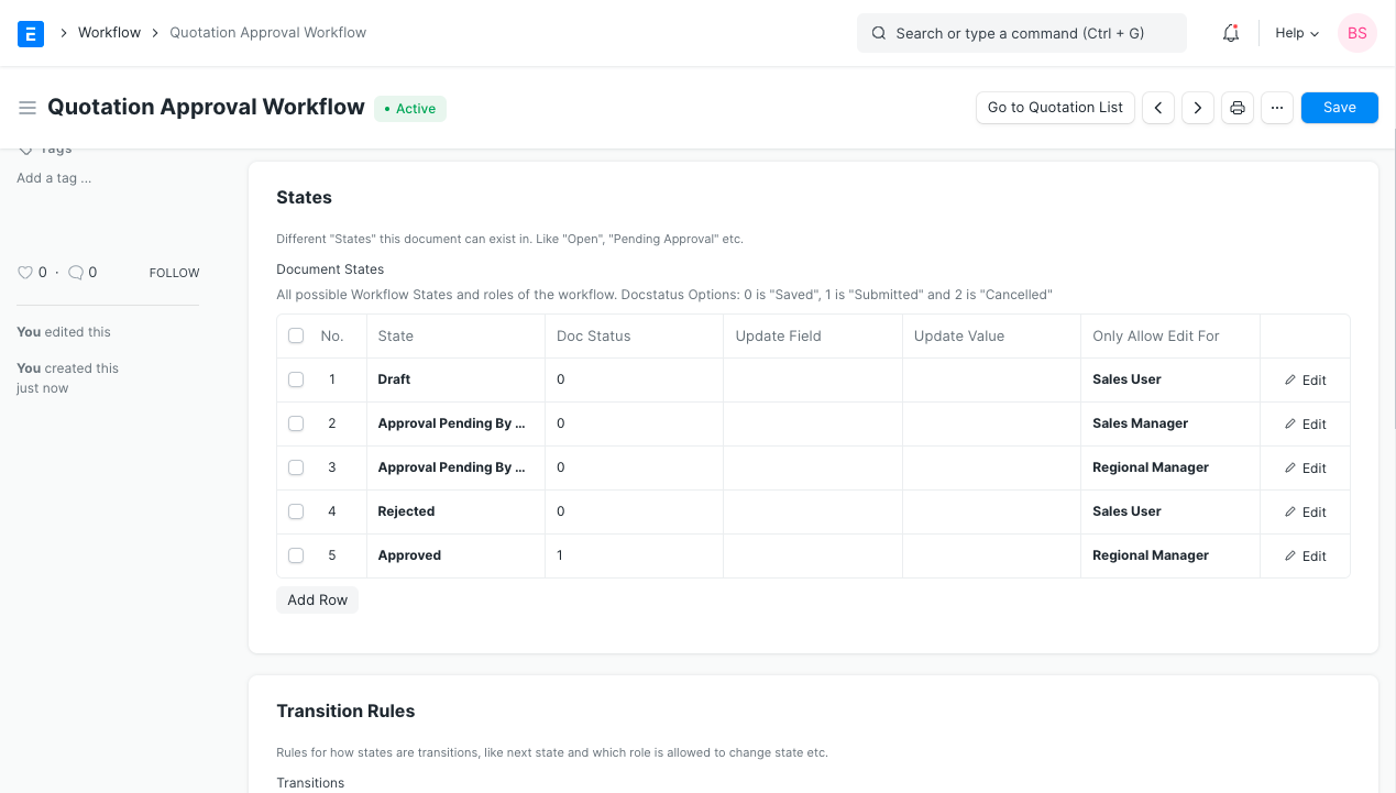 Crear un flujo de trabajo en EspoCRM básicamente anula el flujo de trabajo habitual de Guardar y Enviar. Por lo tanto, el documento funcionará según su flujo de trabajo y no según el flujo de trabajo predefinido. Por lo tanto, es posible que no aparezca el botón/opción Enviar si no lo ha especificado en el flujo de trabajo que cree.