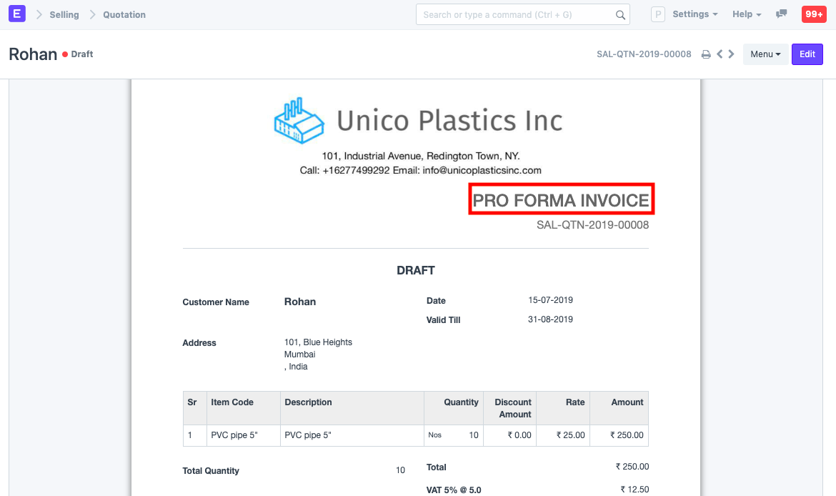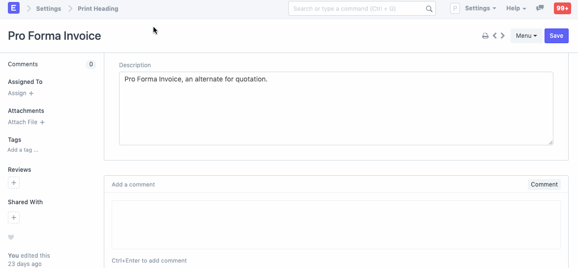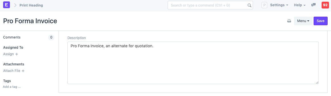 Si desea cambiar el nombre de una transacción al imprimirla, puede hacerlo en la sección «Imprimir encabezados». Por ejemplo, una cotización también se denomina «Propuesta», «Presupuesto» o «Factura proforma».