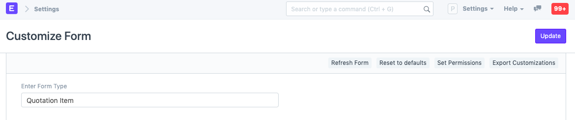 Vaya a Menú > Personalizar, seleccione Elemento de cotización en el campo ‘Ingresar tipo de formulario’.