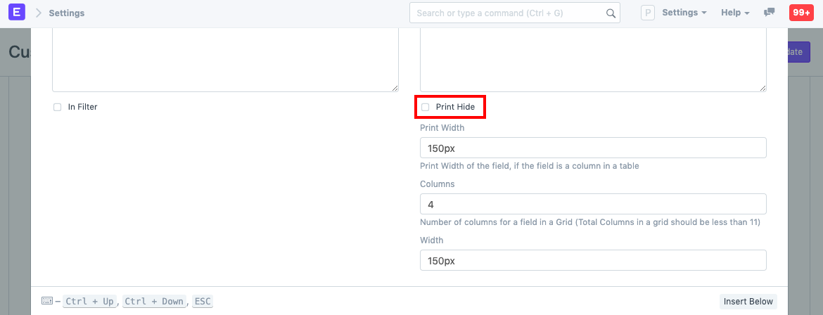 En la tabla de campos, expanda la fila ‘Código de artículo’, desplácese hacia abajo y marque la casilla de verificación ‘Imprimir Ocultar’.