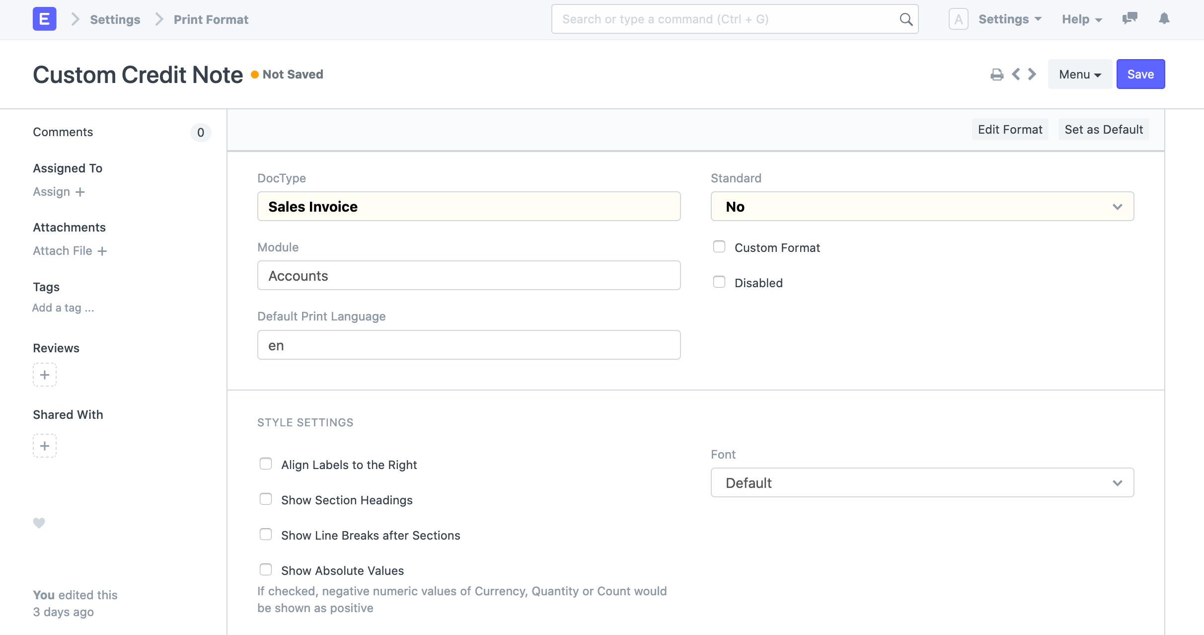 Si el modo de desarrollador está habilitado, puede seleccionar Estándar como Sí para contribuir con un formato de impresión como formato de impresión estándar (preestablecido) en el sistema.