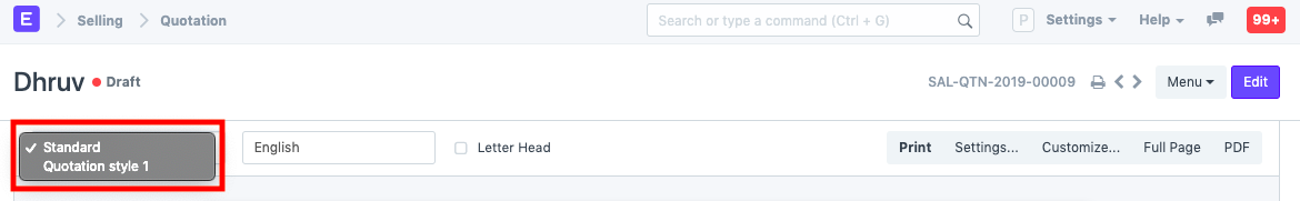 - Introduzca un nombre y seleccione un DocType para el cual se utilizará el formato de impresión.