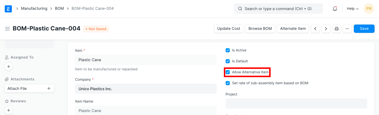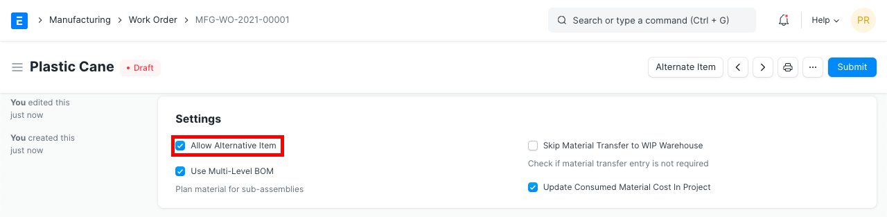 Para permitir el uso de artículos alternativos en el proceso de fabricación, el usuario puede configurar ‘Permitir artículo alternativo’ en la lista de materiales/orden de trabajo.
