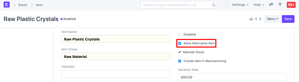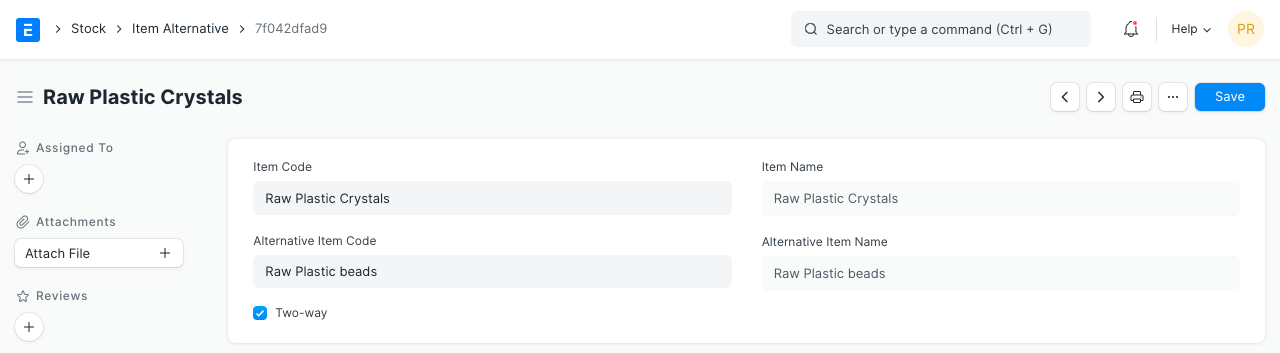 Esto también se puede hacer haciendo clic en el signo más junto a «Alternativa de artículo» en el panel principal de artículos. Puede habilitar la sustitución bidireccional entre un artículo y su alternativa si ambos pueden usarse como alternativa.