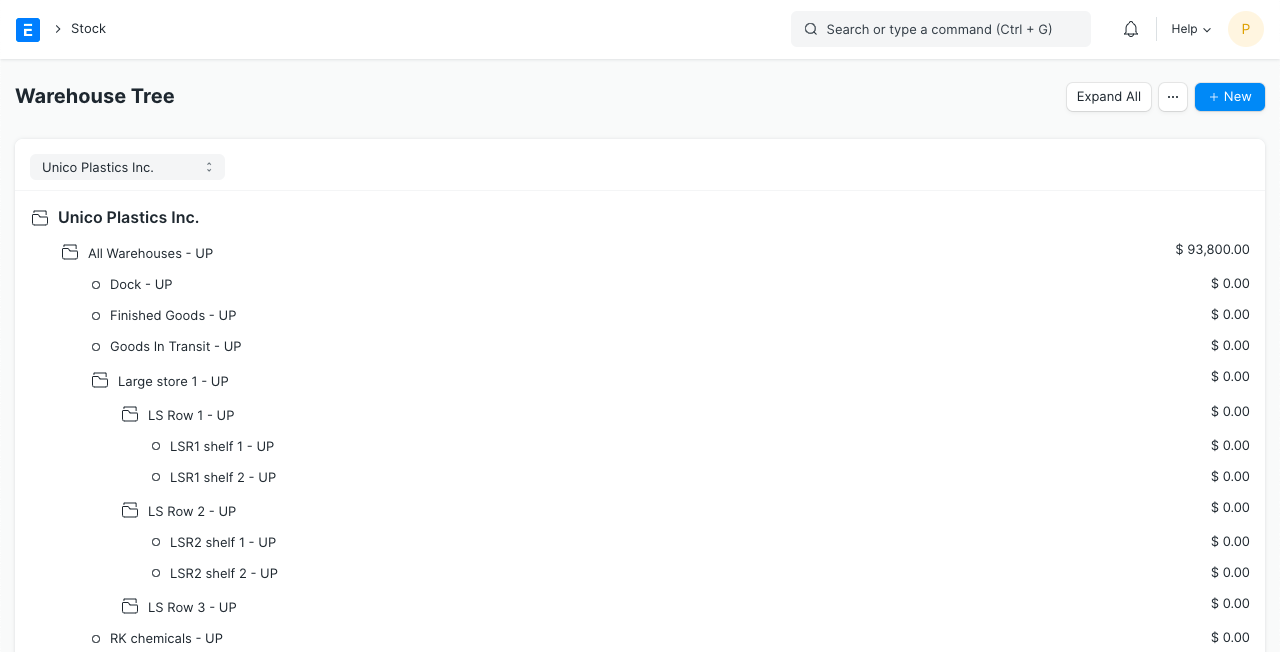 Si tiene un árbol de almacén más detallado, probablemente sea buena idea vincular las sububicaciones (sala, fila, estante, etc.) a la cuenta del almacén real (el almacén raíz de ese árbol), ya que en la mayoría de los casos no es necesario contabilizar el valor de los artículos en stock por estante o contenedor. Por ejemplo, si tiene el almacén A y la sala y las filas son B, C, etc., vincule B y C a la cuenta de A.