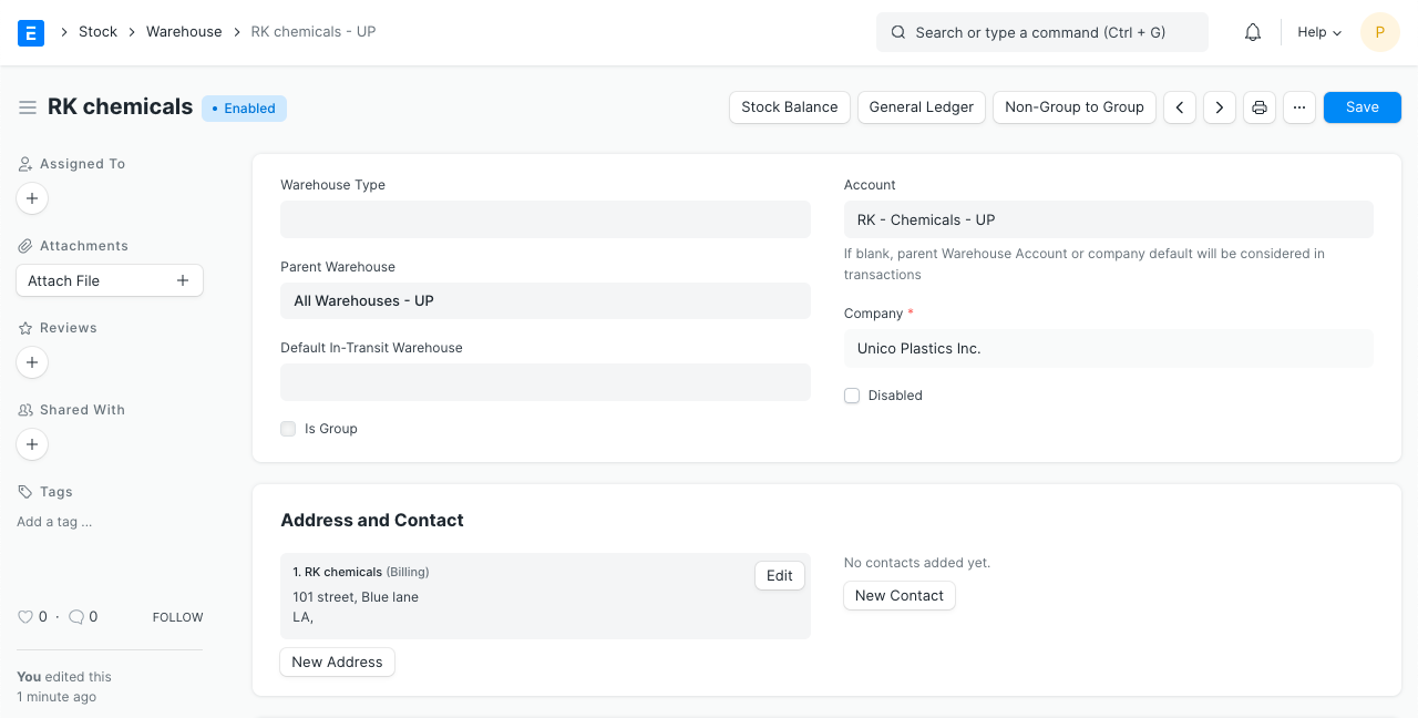 Puede agregar direcciones de facturación, envío y otros tipos de direcciones para el almacén. También puede agregar un contacto, por ejemplo, el gerente del almacén.