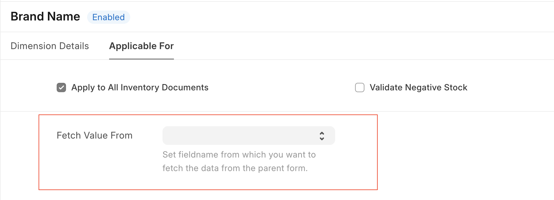 - A continuación, el usuario debe colocar el nombre de la dimensión contra la cual el sistema creará un campo de vínculo personalizado en los Documentos aplicables.