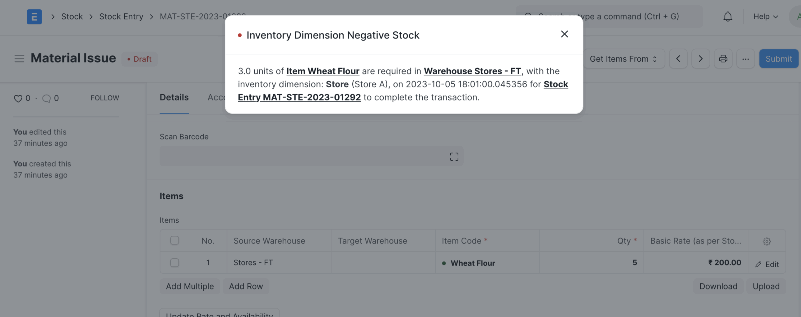 Si el usuario ha activado la casilla «Validar Stock Negativo» en la dimensión de inventario, el sistema no permitirá realizar transacciones de stock si la dimensión respectiva tiene stock negativo en el almacén correspondiente. Si el usuario ha intentado crear la transacción de stock con stock negativo para la dimensión de inventario, el sistema mostrará el siguiente error.