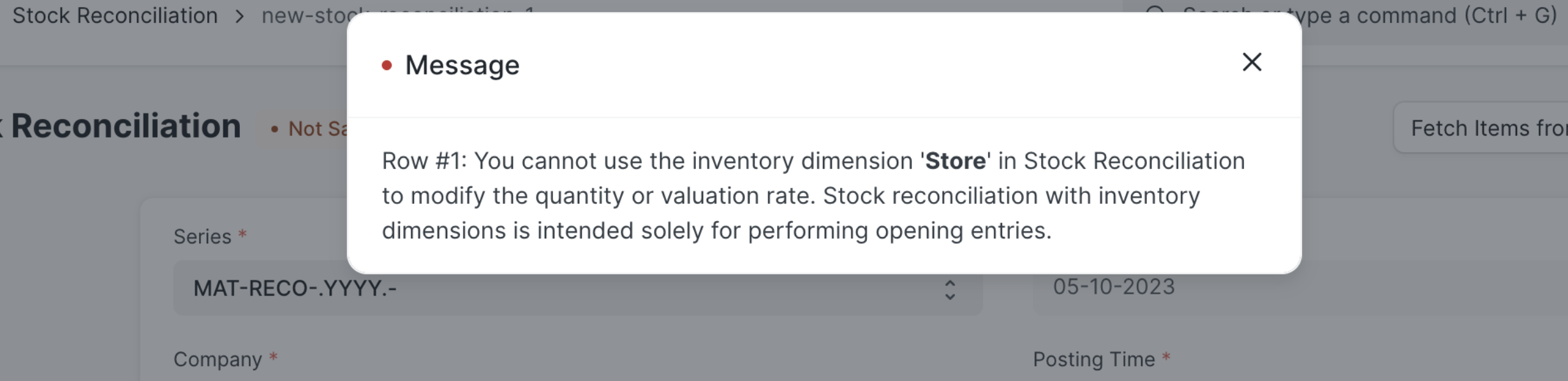 El usuario solo puede usar la conciliación de stock con las dimensiones del inventario para ingresar valores iniciales, pero no puede usarla para modificar el stock disponible ni la valoración. Dado que no se mantiene la tasa de valoración según las dimensiones del inventario, no tiene sentido permitir modificarla mediante la conciliación de stock. Si se intenta actualizar la cantidad o la tasa de valoración mediante la conciliación de stock, el sistema mostrará el siguiente error.