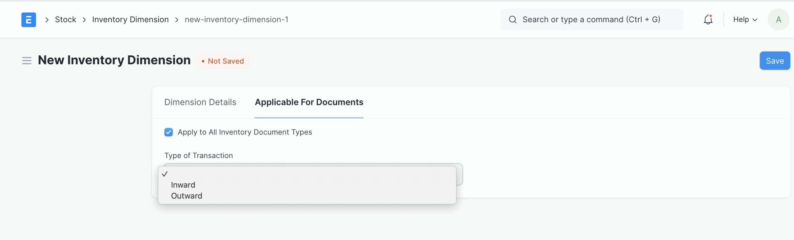- Si el usuario desea agregar la dimensión de inventario a un documento específico, debe deshabilitar la casilla de verificación «Aplicar a todos los tipos de documentos de inventario» y seleccionar el documento respectivo en el campo «Aplicable al documento».