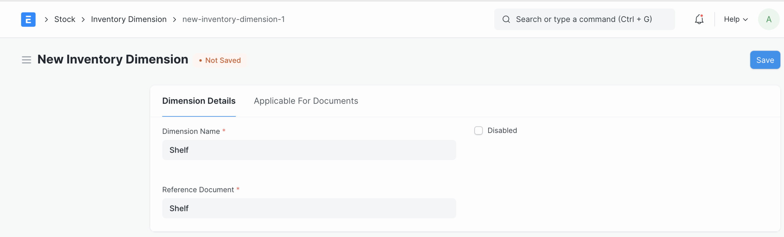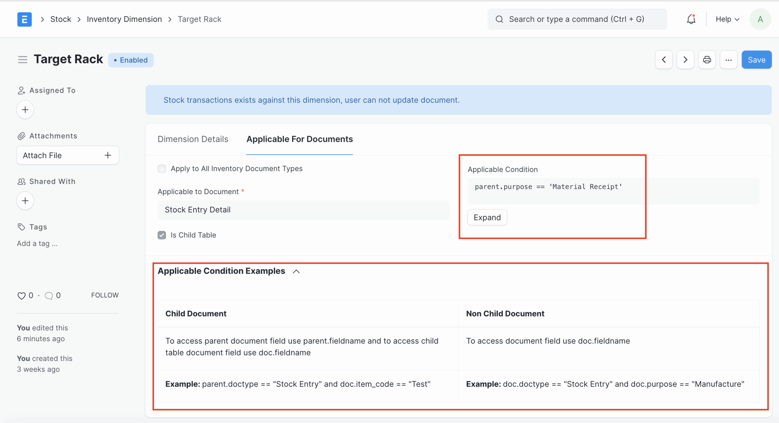 - Además, si desea agregar la dimensión de inventario para una condición específica, como para el tipo de entrada de stock Emisión, desea una dimensión separada como «Desde el estante» y el tipo de entrada de stock Recibo de material, desea una dimensión separada como «Al estante», entonces eso puede ser posible usando «Condición aplicable».