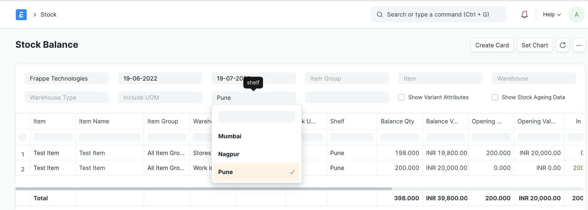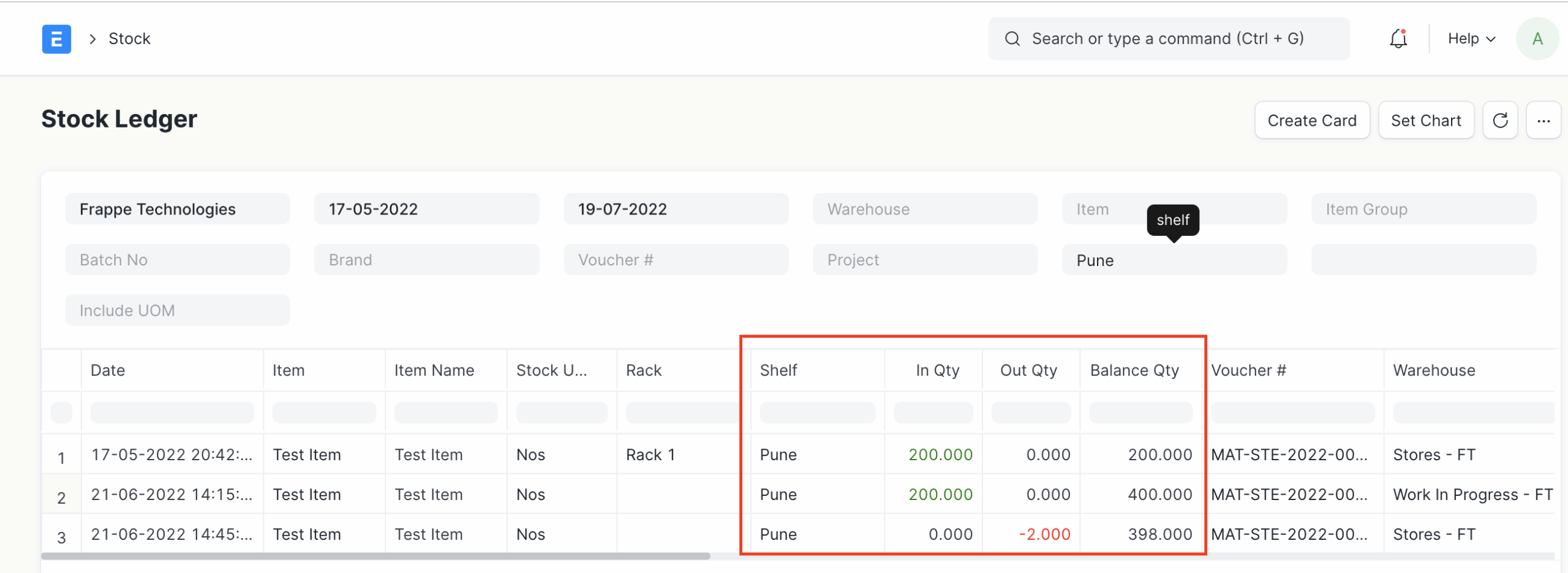 - Por ejemplo, si el usuario ha añadido la dimensión de inventario «Estante» en el documento de detalle de entrada de stock, en la entrada de stock, el usuario de la tabla secundaria tendrá la opción de seleccionar el estante (ver imagen superior). Tras el envío, el sistema creará los libros de inventario con las dimensiones de inventario seleccionadas.