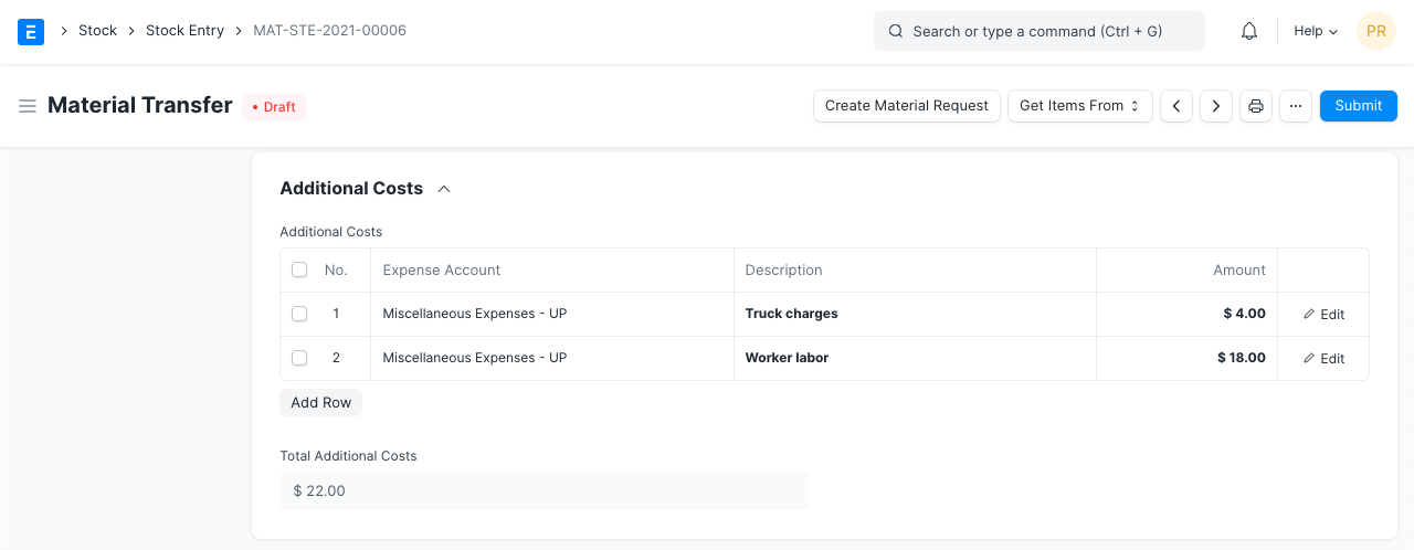 Si la entrada de inventario es una entrada entrante, es decir, si un artículo se recibe en un almacén de destino, puede agregar los costos adicionales relacionados (como gastos de envío, aranceles aduaneros, costos operativos, etc.) asociados al proceso. Estos costos adicionales se considerarán para calcular la tasa de valoración de los artículos.
