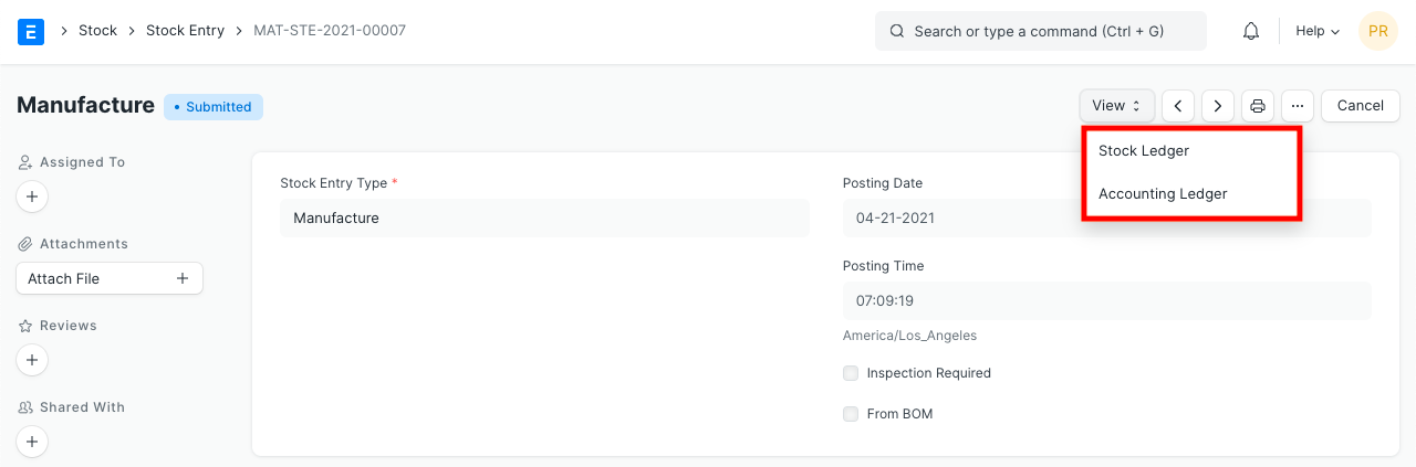 Después de enviar una entrada de stock, puede ir al libro mayor de existencias o al libro mayor de contabilidad desde el panel de control.