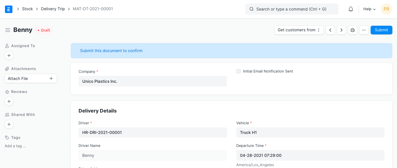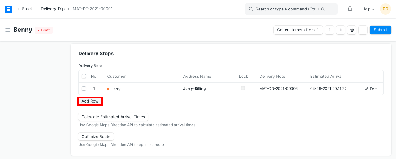 Agregue clientes para las paradas de entrega; se obtendrá la dirección si ya está configurada. También puede obtener clientes haciendo clic en «Obtener clientes de > Nota de entrega». Puede agregar paradas de entrega adicionales haciendo clic en el botón «Agregar fila» antes de enviar.
