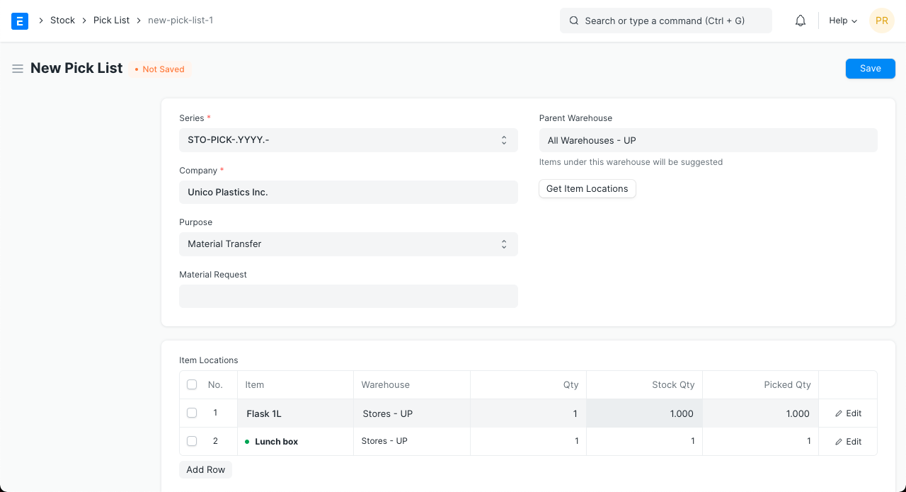 - Agregue el artículo y la cantidad que desea recoger en la tabla «Ubicaciones de artículos». Haga clic en » Obtener ubicaciones de artículos» para obtener el almacén y otros detalles de cada artículo.