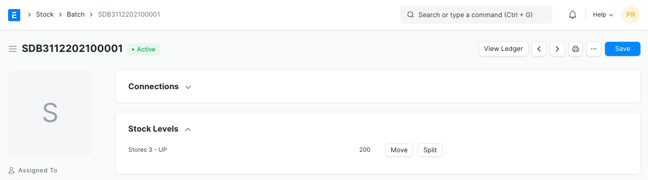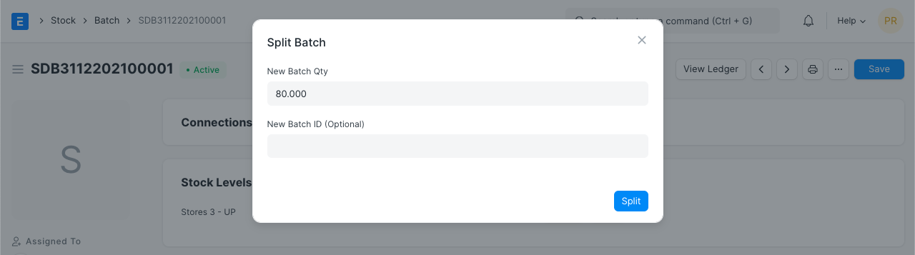 - También puede dividir el lote en lotes más pequeños haciendo clic en el botón «Dividir» . Esto creará un nuevo lote basado en este y las cantidades se dividirán entre los lotes.