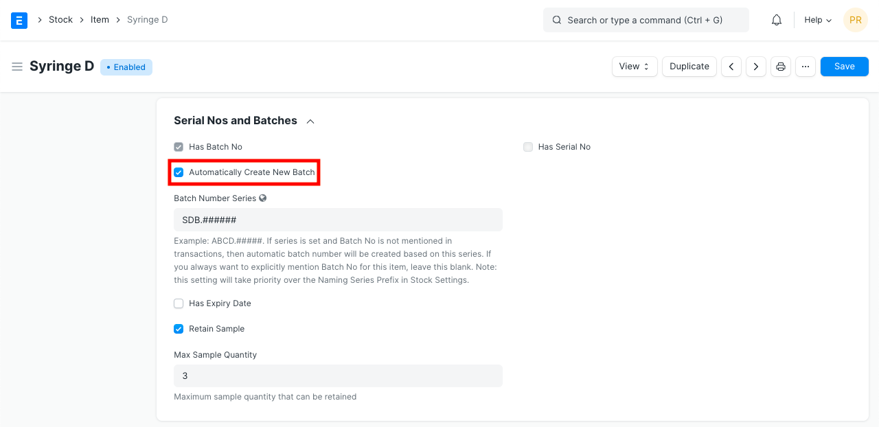 Cuando se habilitan lotes para un artículo, también está disponible la opción de conservar stock de muestra .