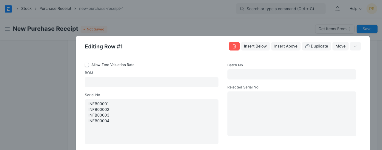 Si se reciben artículos comprados con números de serie asignados por el OEM (fabricante de equipos originales), también puede registrar el mismo número de serie en EspoCRM. Al crear el recibo de compra, deberá escanear o ingresar manualmente los números de serie del artículo. Al enviar el recibo de compra, se crearán los números de serie en el backend según los números de serie proporcionados para el artículo. Si se utiliza el número de serie del OEM, en el maestro de artículos, no se debe mencionar el prefijo para la serialización. En este caso, el campo de prefijo debe dejarse en blanco.