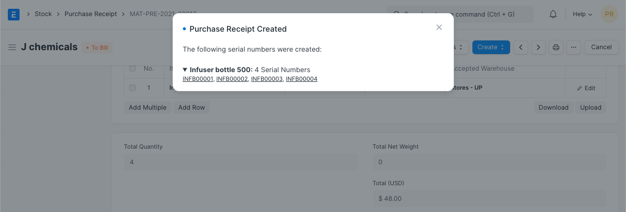 Al enviar el recibo de compra o la entrada de stock del artículo serializado, los números de serie se generarán automáticamente.