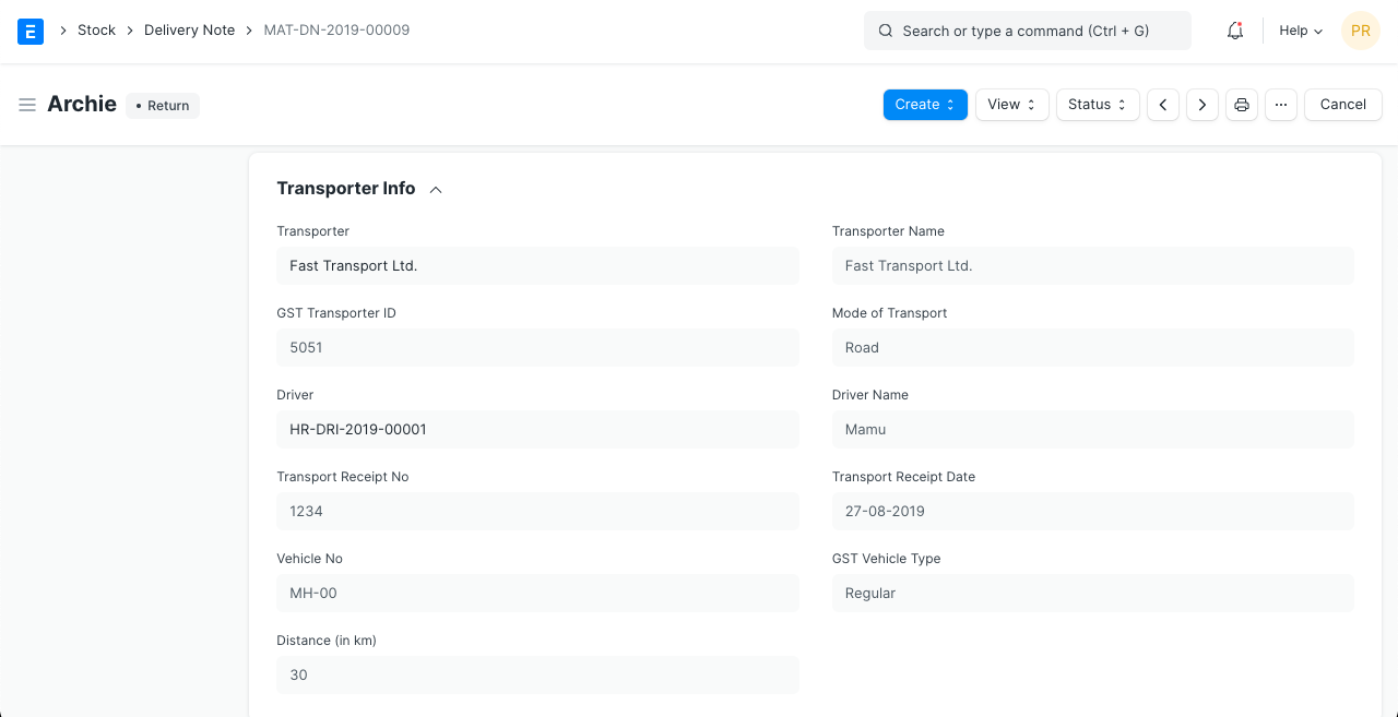 La entrada de una nota de entrega es muy similar a la de un recibo de compra. Generalmente, se crea a partir de un pedido de venta enviado (no enviado) haciendo clic en Crear > Entrega.