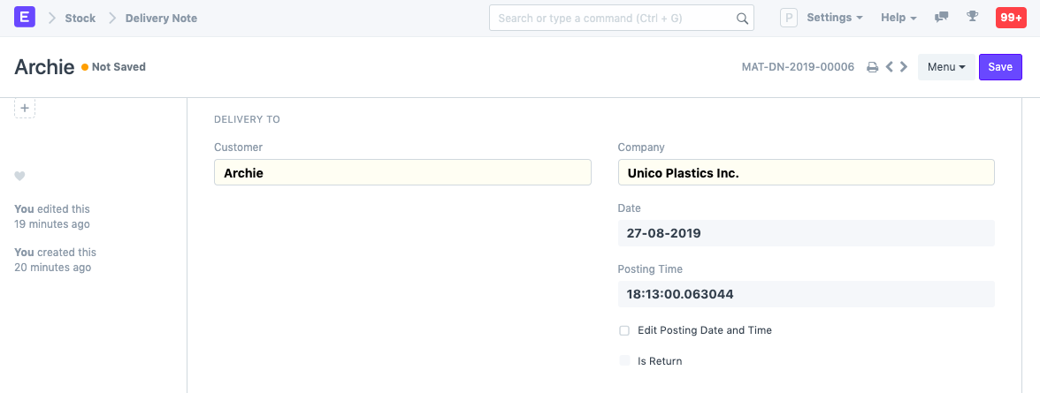 Notarás que toda la información sobre los artículos no enviados y otros detalles se transfieren desde tu pedido de venta si creas la nota de entrega desde allí.