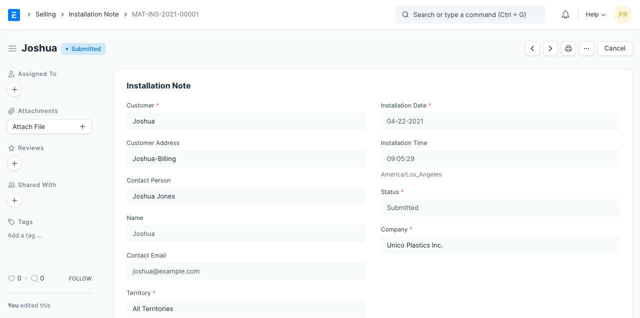 Por ejemplo, si vende un aire acondicionado, un técnico de servicio generalmente acompaña la entrega para instalarlo en casa del cliente. Este técnico puede crear una «Nota de Instalación» para registrar la fecha y los detalles de la instalación.