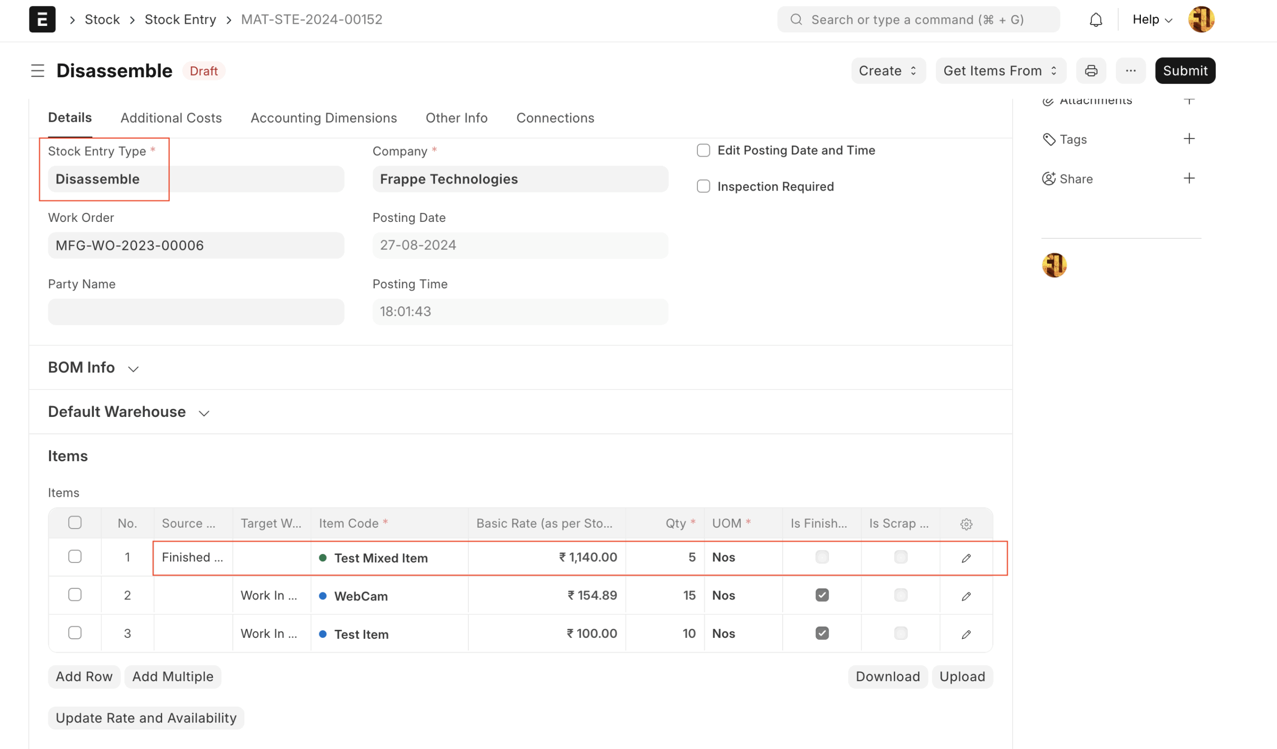 Una vez que el usuario haga clic en el botón «Orden de desmontaje», el sistema abrirá la entrada de stock con el tipo «Desmontar».