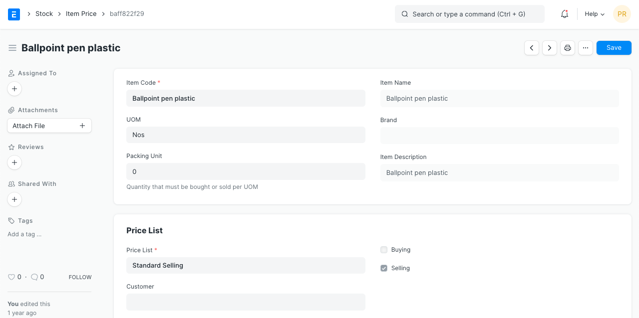 Un precio siempre corresponde a una unidad de medida (UM) específica. Por ejemplo, $1 por kg o $80 por hora . De forma predeterminada, el precio del artículo obtendrá la unidad de medida predeterminada del artículo . Puede cambiarla a cualquier UM desde la tabla de UM del artículo.