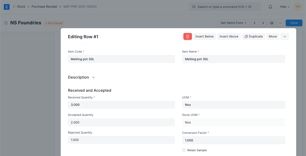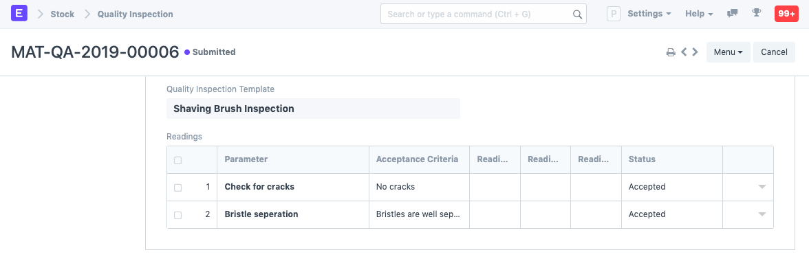 Después de habilitar los Criterios de inspección en el formulario de Artículo para Compra y adjuntar allí una Plantilla de Inspección de Calidad, las Inspecciones de Calidad se pueden registrar en los Recibos de Compra.