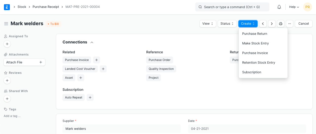 Un recibo de compra se crea generalmente a partir de una orden de compra . En la orden de compra, haga clic en Crear > Recibo de compra.