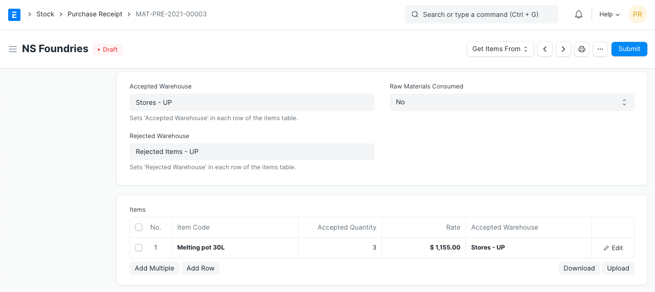 - Puede configurar el almacén aceptado para todos los artículos en este recibo de compra. Este valor se obtiene si se configura en la orden de compra.