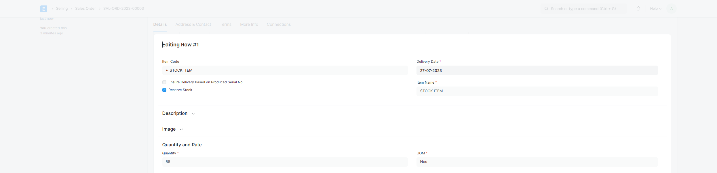 Haga clic en Reserva de Stock y seleccione Reservar . Seleccione el almacén y la cantidad, y haga clic en el botón Reservar Stock .