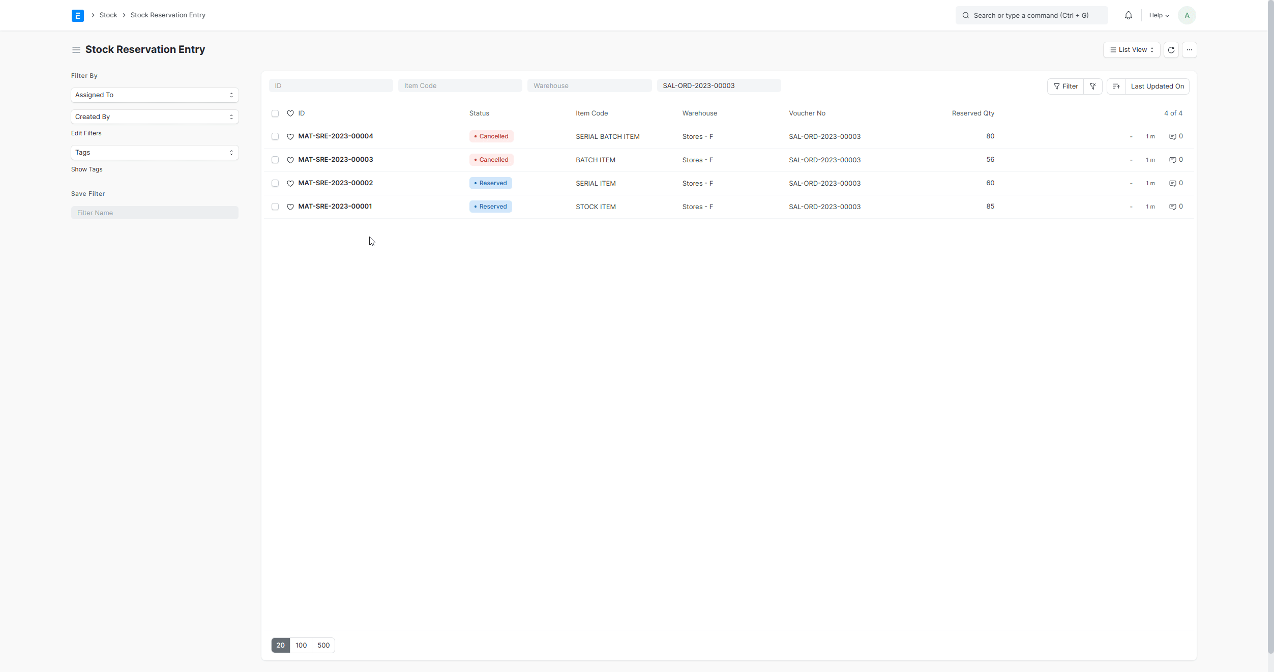 - Abra un documento y haga clic en el botón Reserva de stock > Cancelar reserva ; las entradas de reserva de stock enumeradas se cancelarán.