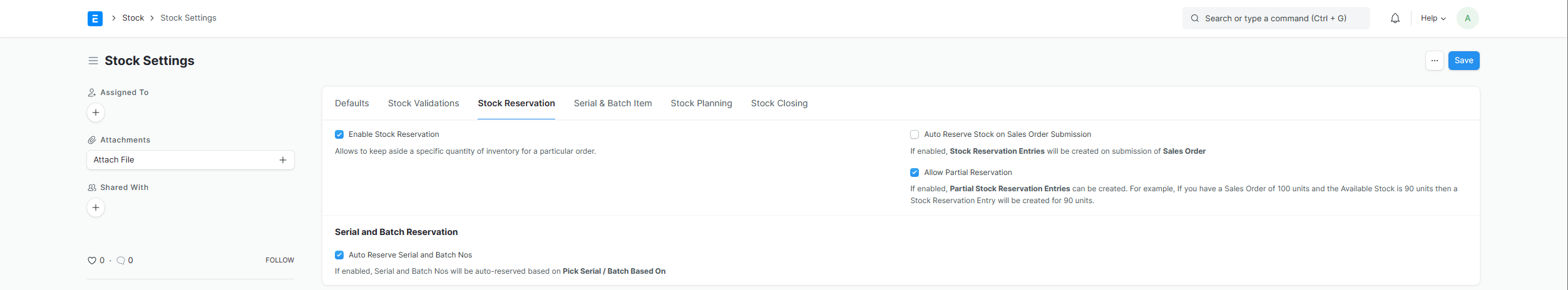 - Vaya a Configuración de stock y habilite la Reserva automática de stock para pedidos de venta en el momento de la compra .